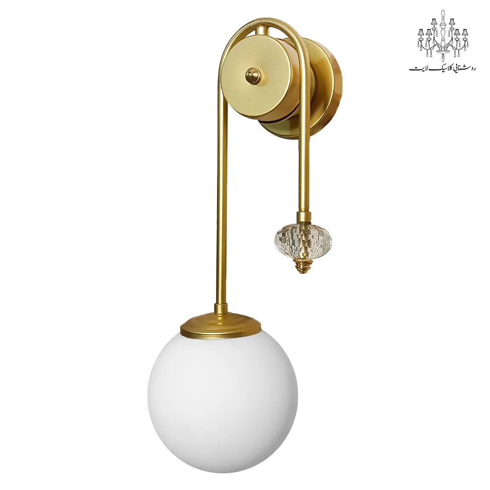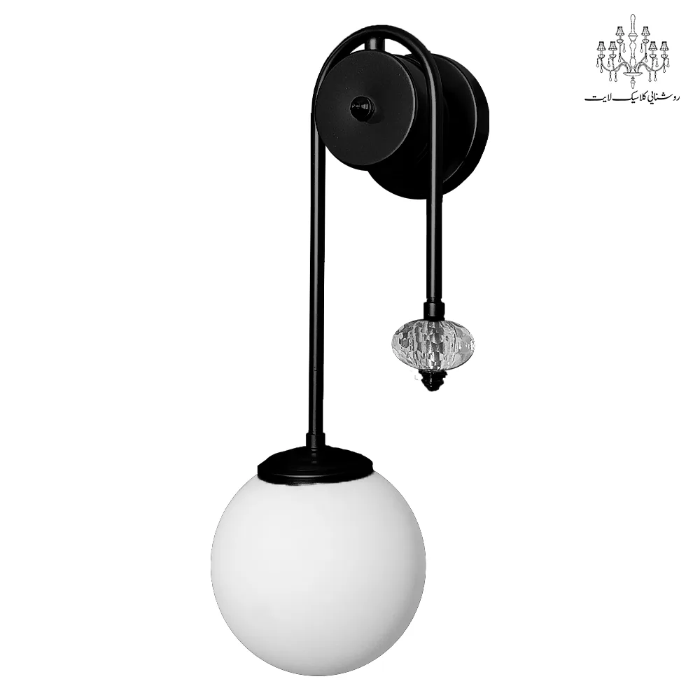 بدنه چراغ از فلز مقاوم ساخته شده و همراه با حباب شیشه‌ای سفید، نور را به‌طور یکنواخت و نرم در فضا پخش می‌کند. طراحی خاص و وجود کریستال تزیینی روی بدنه، جلوه‌ای شیک و متفاوت به دیوار و محیط اطراف می‌بخشد.